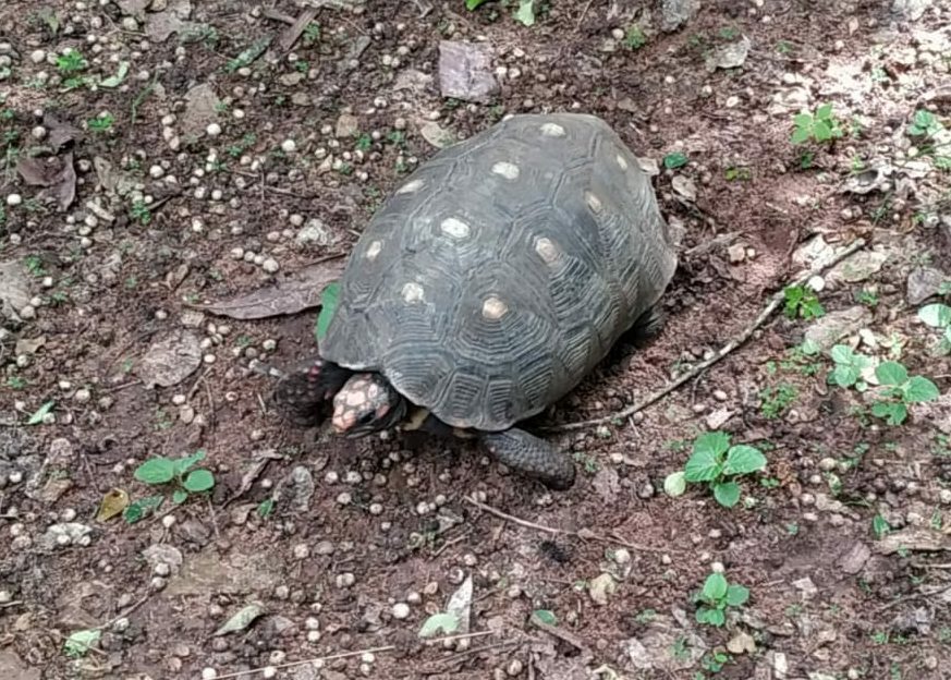 Ao checar no local, os policiais encontraram no quintal da residência um Jabuti Piranga, sem autorização do órgão competente. Diante do exposto, doi elaborado um auto de infração de advertência.