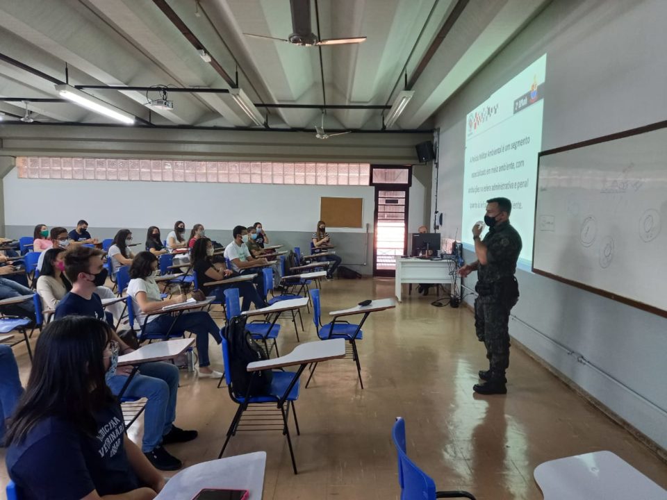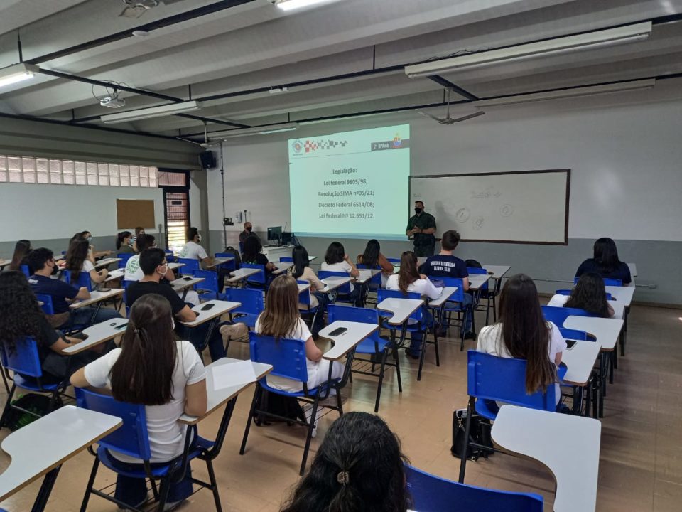 Também ontem foi realizada palestra à 45 alunos do 2° ano do curso de medicina veterinária. A equipe, composta pelo 1° tenente Ventrone e cabo Fernandes, abordou diversos temas ambientais nas mais diversas áreas de atuação do policiamento.