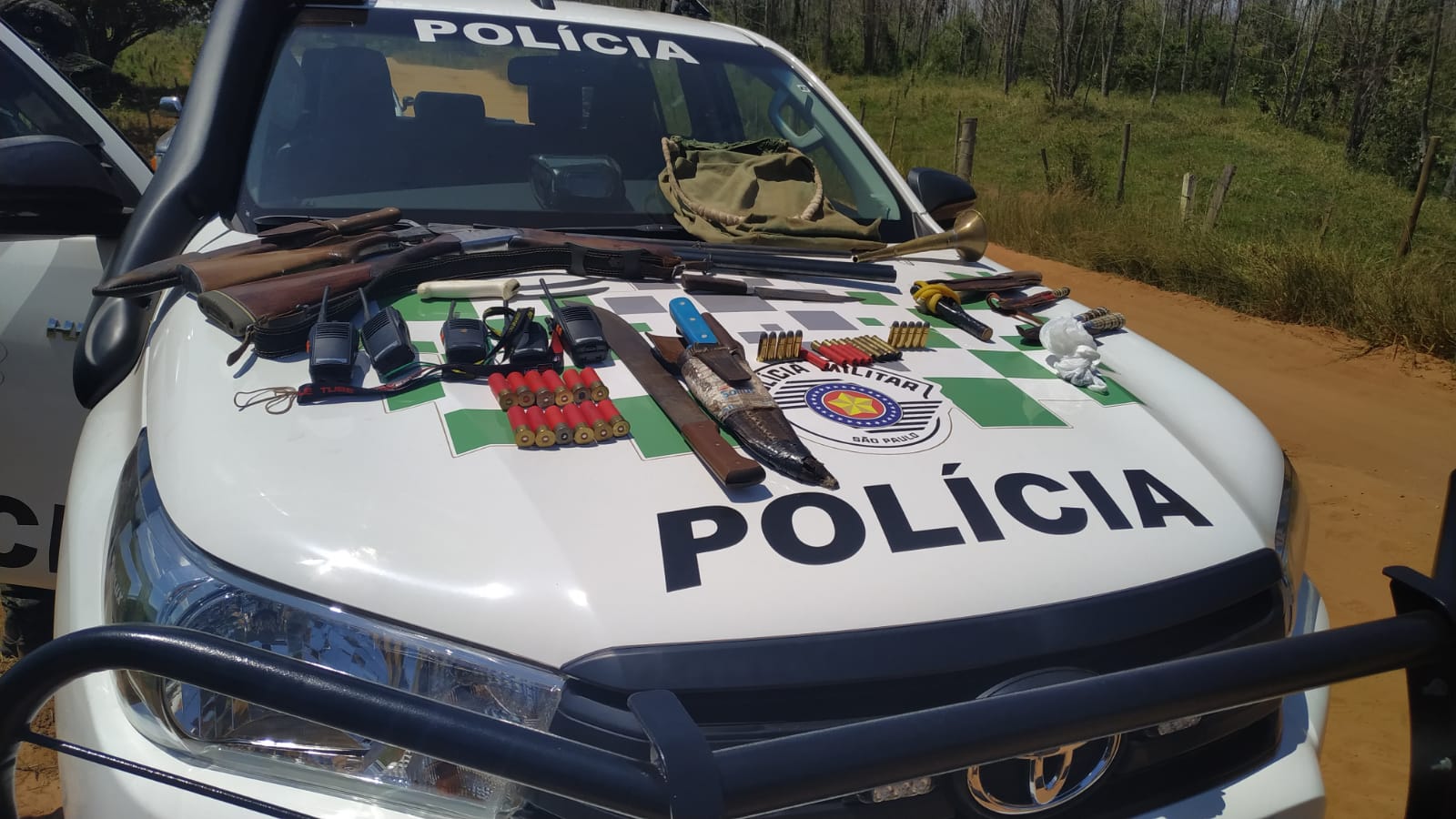 Com eles haviam outros petrechos de caça. Um outro infrator conseguiu se evadir das guarnições, no entanto foi identificado, pois seus documentos estavam no veículo inicialmente abordado.