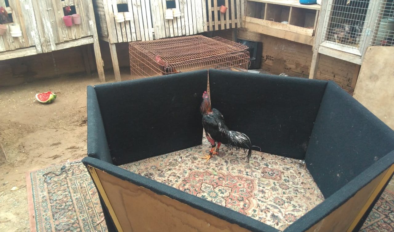 Outros 14 galos foram apreendidos na residência acomodados em viveiros de madeira, sem nenhum tratamento adequado para os ferimentos causados na rinha.