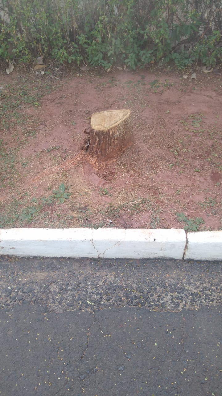 Após denúncia, uma equipe se deslocou até a Alameda dos Pinheiros, onde constatou o corte em logradouro público, de duas árvores da espécie ipê.