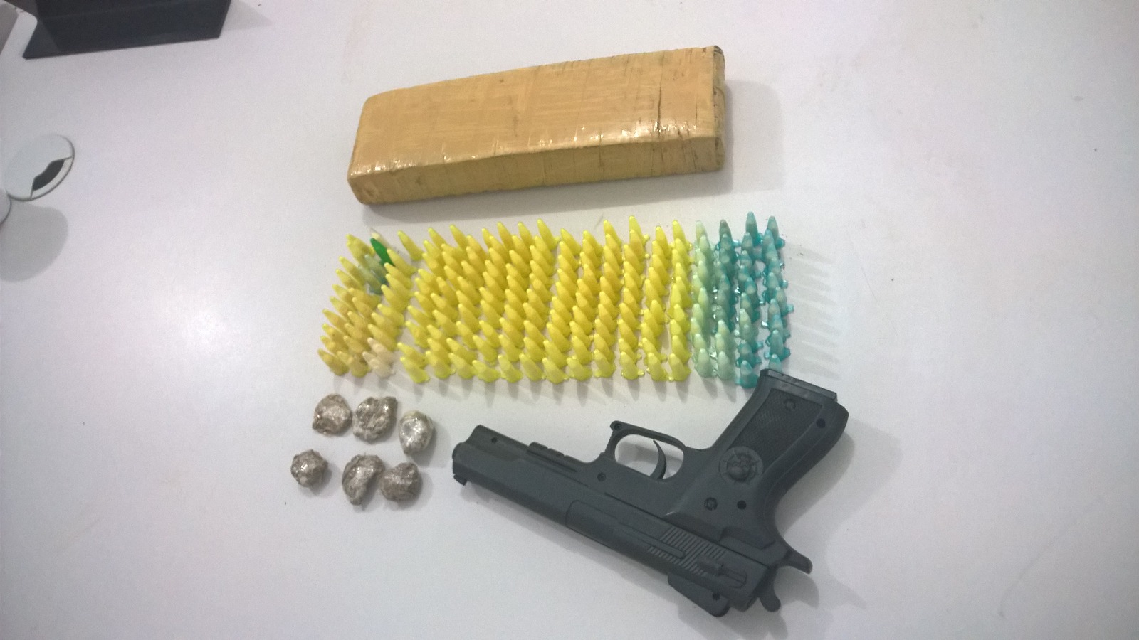 Segundo a PM, uma denúncia anônima via telefone 190 levou os policiais até o local. Após vistoria no terreno indicado, a equipe encontrou 190 pinos com crack, um tijolo de maconha, algumas porções da erva prontas para venda e a arma falsa.