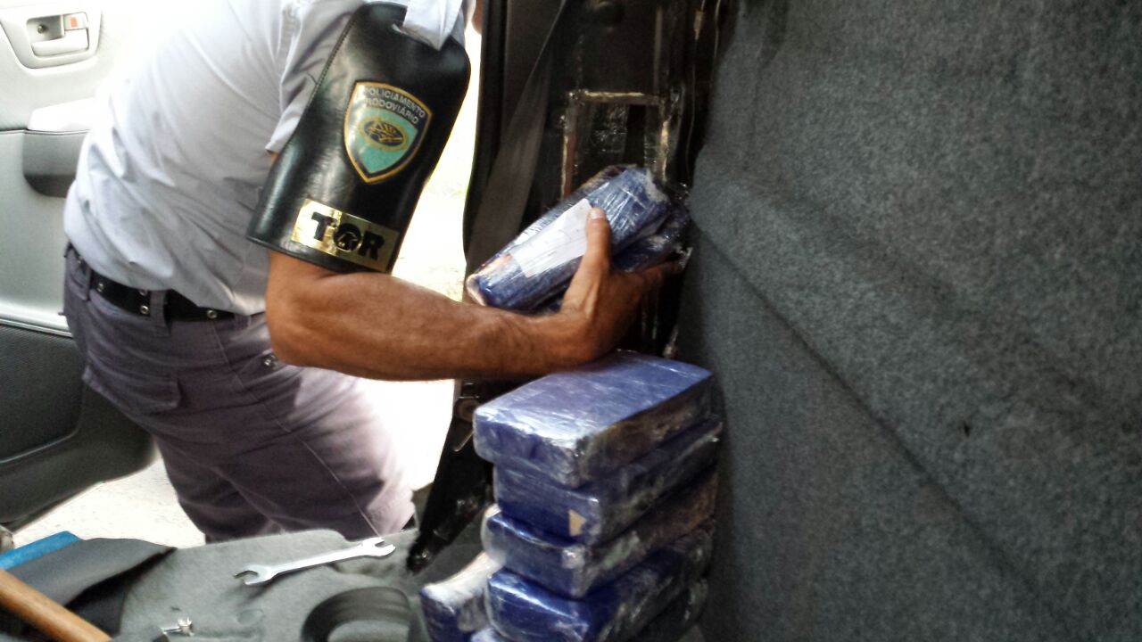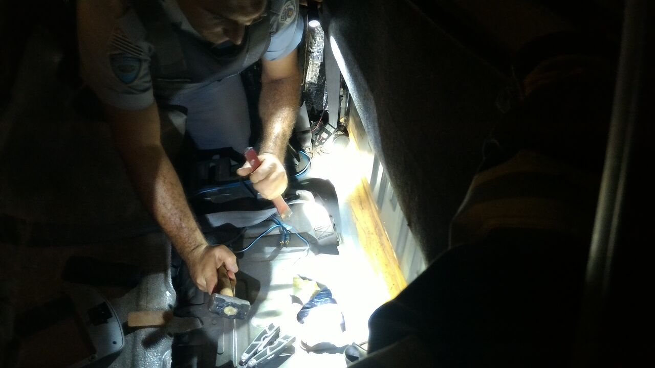 Ainda de acordo com a polícia, após busca minuciosa no veículo, foram localizados sob um fundo falso no banco traseiro, cerca de 80 tabletes da droga. Não foi informado como as equipes chegaram até o o veículo.