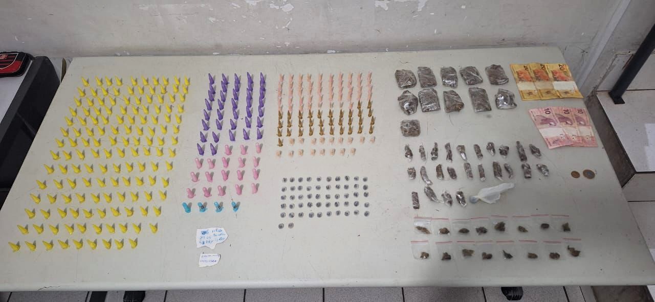 No total, a PM apreendeu 198 microtubos de cocaína, divididos em dois lotes (178,24 g e 116,65 g), além de 98 microtubos de crack (78,09 g), 52 microtubos com a substância conhecida como “dry” (42,29 g) e 52 porções de maconha (356,20 g). Também foram recolhidos R$ 91,10 em dinheiro e anotações que indicam a prática do tráfico.