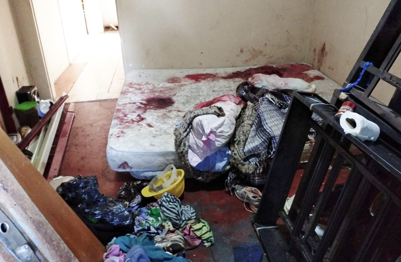 Aline foi encontrada no canto do colchão, voltada para a parede; já o corpo de Júlio estava parcialmente no chão (Foto: Alexandre Mansinho/TV SAN)