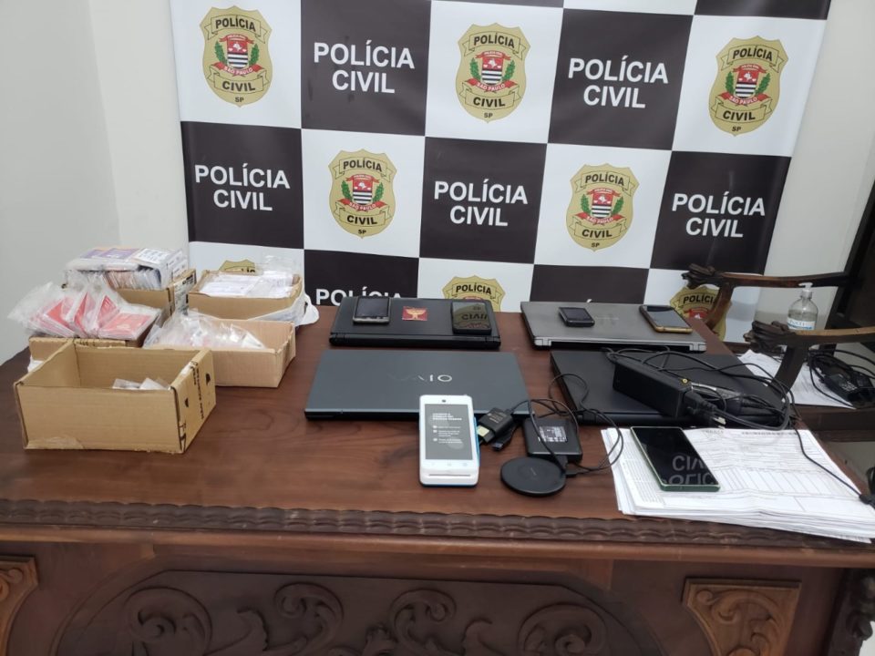 Durante a ação, os policiais apreenderam na residência de um investigado um máquina de cartão, quatro notebooks, cinco celulares, grande quantidade de chip’s – total 1.115 – das operadoras Vivo, Claro e Oi – notas fiscais, um HD externo.