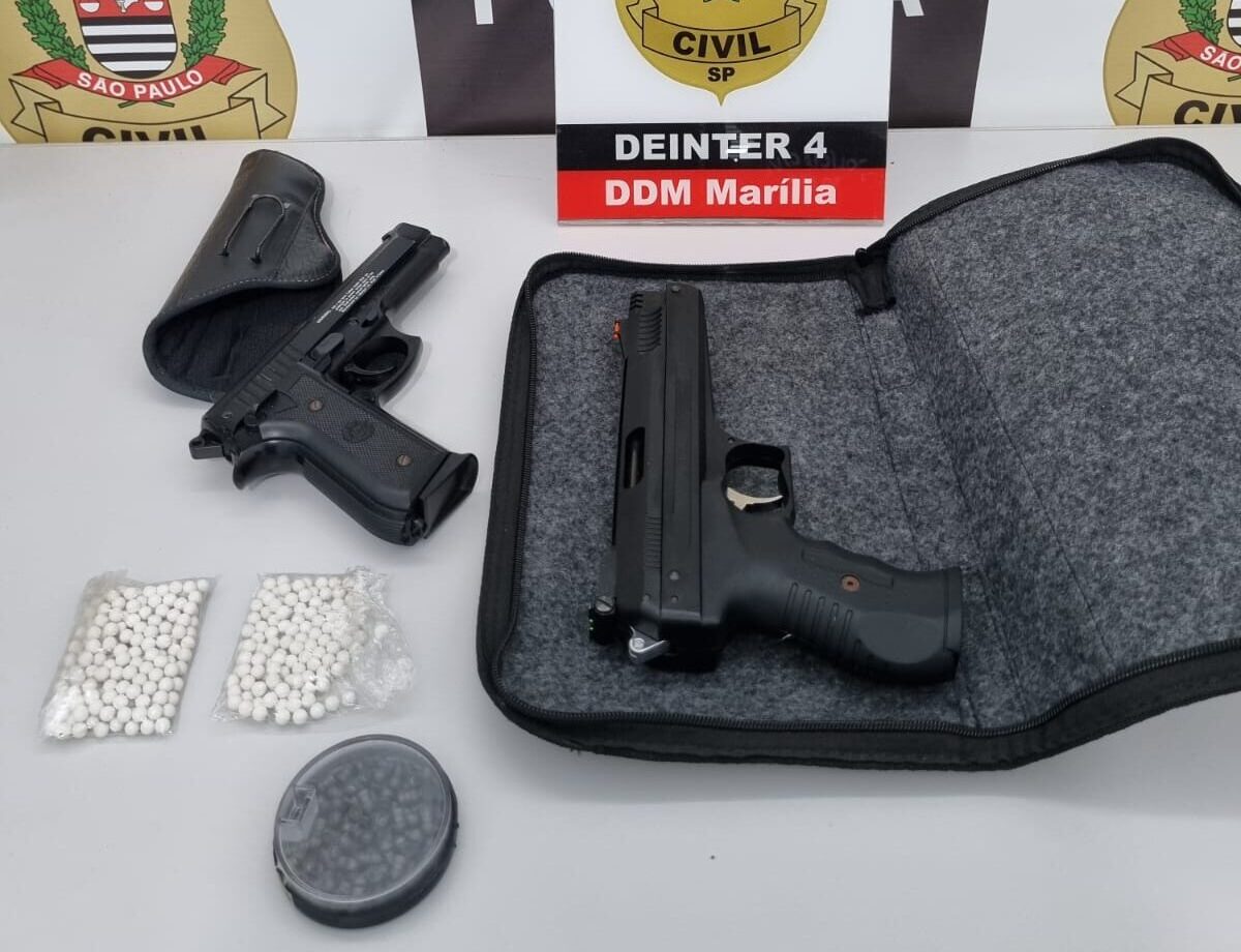 A Polícia Civil de Marília apreendeu dois simulacros de arma de fogo durante uma operação da Delegacia de Defesa da Mulher (DDM) nesta quarta-feira (19). A ação ocorreu em uma residência no bairro Cascata, na zona leste da cidade. No mesmo dia, um idoso foi detido com uma arma no bairro Santa Clara (zona sul). Ninguém foi preso.