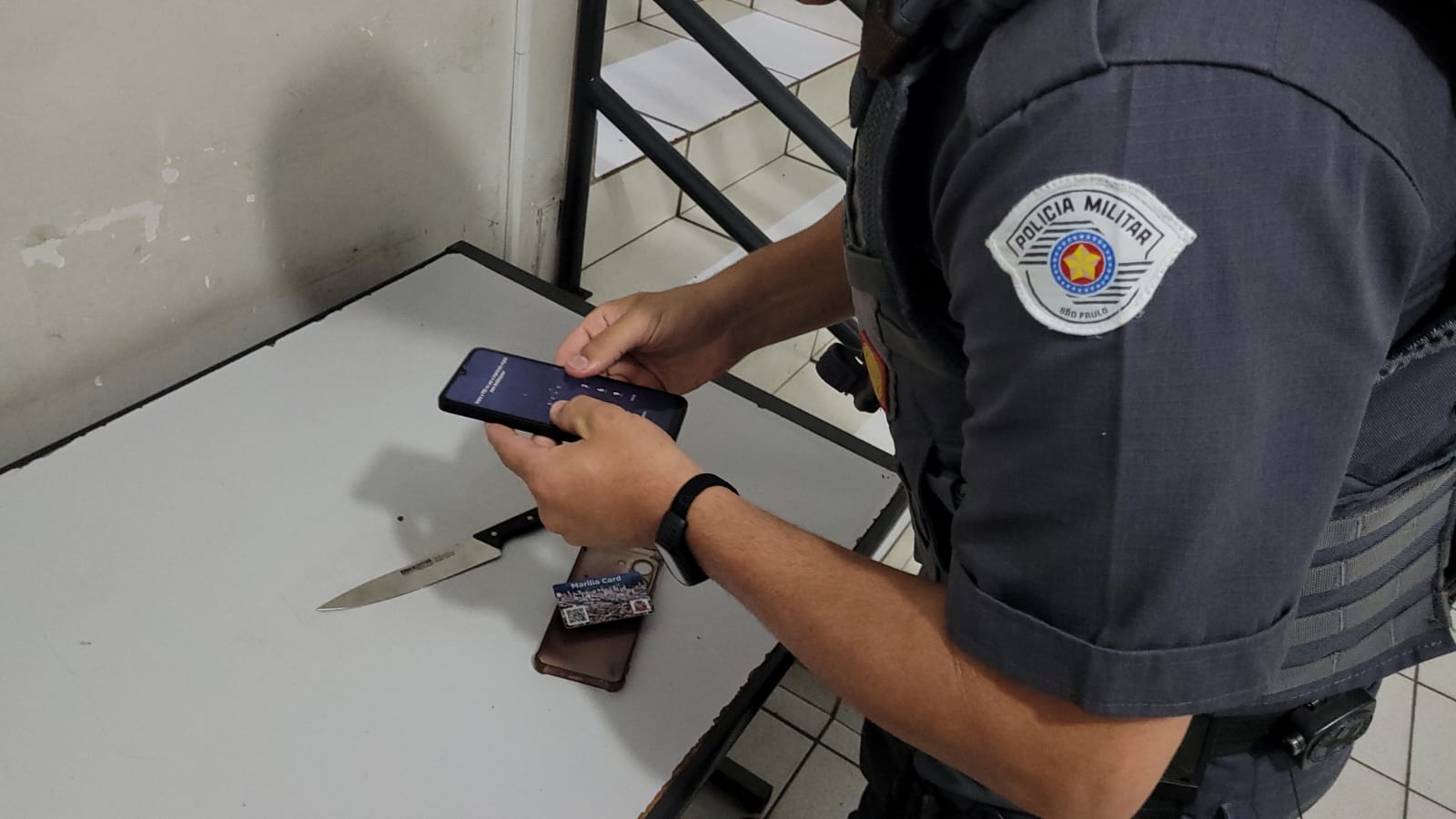Celular roubado foi recuperado pela PM, que também apreendeu faca usada no crime (Foto: Alcyr Netto/Marília Notícia)