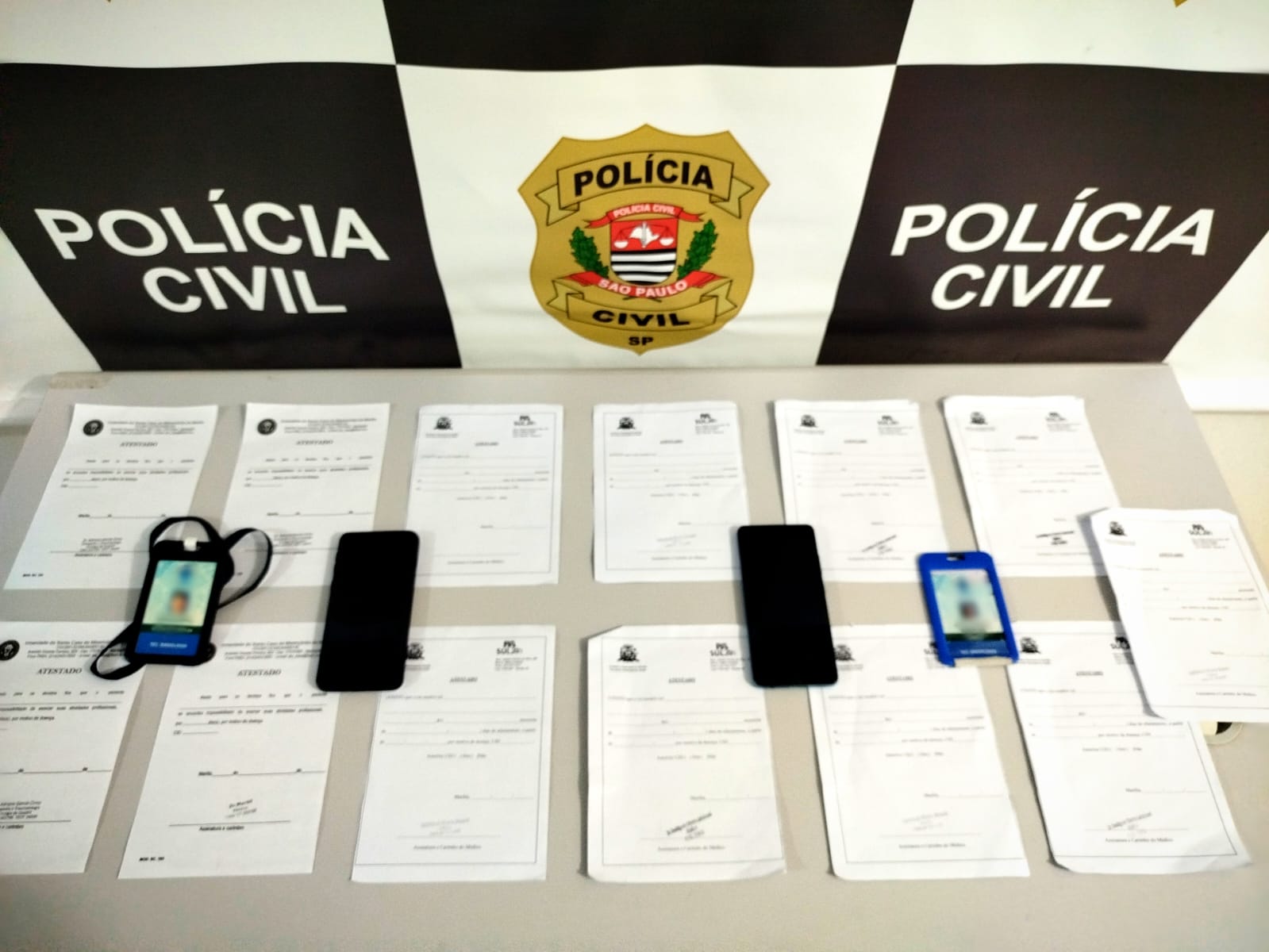 Os policiais cumpriram mandados de busca e apreensão em endereços ligados aos investigados e encontraram 14 atestados médicos em branco, já com carimbos de profissionais da saúde — entre eles nomes vinculados à Unidade de Pronto Atendimento (UPA) sul 24h e à Santa Casa de Marília. Os documentos estavam prontos para serem preenchidos e usados de forma fraudulenta, segundo a investigação.