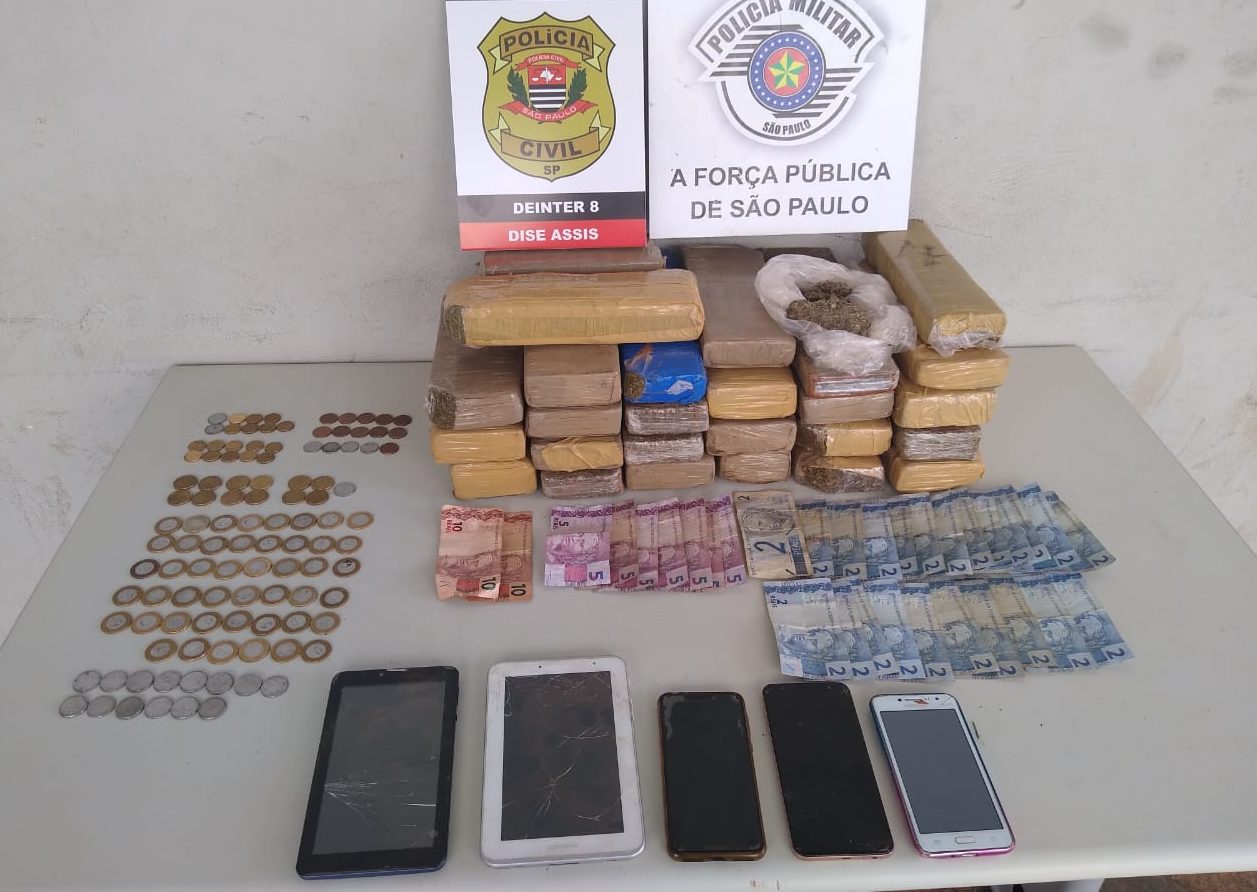 Na residência foram encontradas e apreendidas duas sacolas contendo 26 tijolos de maconha, além de uma porção a granel da mesma substância, R$ 159,90, três aparelhos celulares, dois tablets e vários documentos em nome de M.L.C. e de P.S.S.