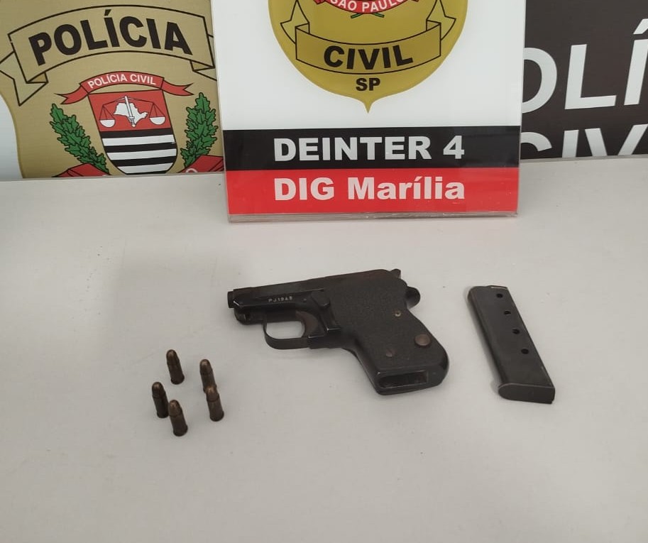Mandado foi expedido pela 2ª Vara Criminal da cidade e cumprido por uma equipe da Delegacia de Investigações Gerais (DIG). Durante a busca, os policiais localizaram uma pistola calibre 6.35 da marca Taurus, modelo PT 51, municiada com cinco cartuchos intactos. O armamento estava escondido sobre a laje do banheiro da casa.