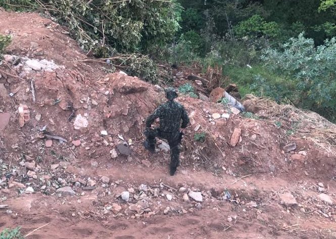 Após denúncia, uma equipe constatou degradação ambiental em área de preservação permanente (APP) de nascente, onde em um terreno estava sendo depositado restos de construção civil e terra vermelha, no intuito de aumentar o terreno para estacionar os veículos.