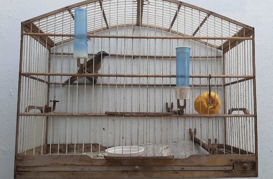 Durante patrulhamento, a Polícia Ambiental constatou uma gaiola pendurada na área externa de uma residência com uma ave da espécie Trinca Ferro.