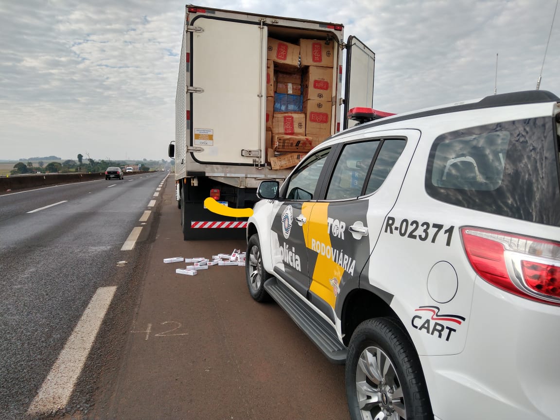 Quando os policiais solicitaram a nota fiscal verificaram que havia divergências na consulta da mesma e realizaram uma busca no caminhão, onde foi localizada grande quantidade de cigarros contrabandeados do Paraguai.