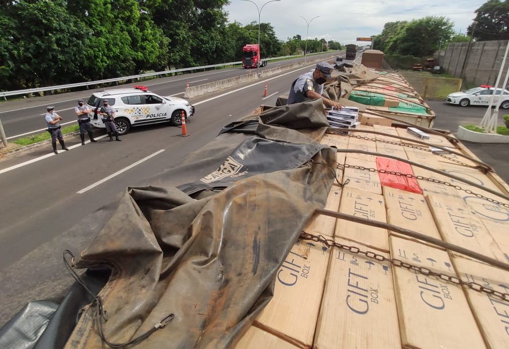 Duas carretas com maços de cigarros foram abordadas pela polícia (Foto: Divulgação)