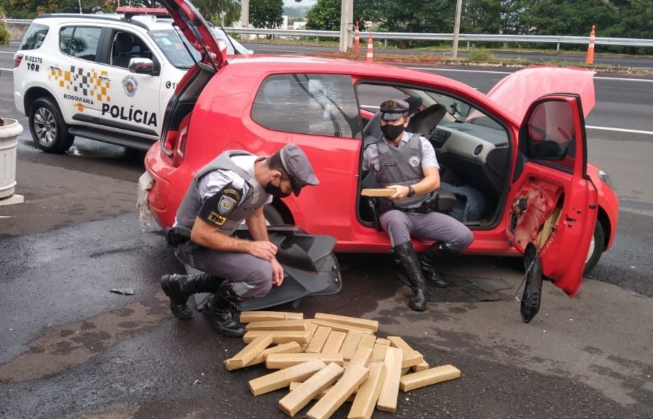O condutor estava apreensivo e nervoso e por isso foi realizada uma busca pessoal e veicular. Os policiais localizaram dentro das portas dianteiras e traseiras, embaixo do painel e no compartimento do motor 51 tabletes de maconha, que totalizaram 45,653 quilos da droga.