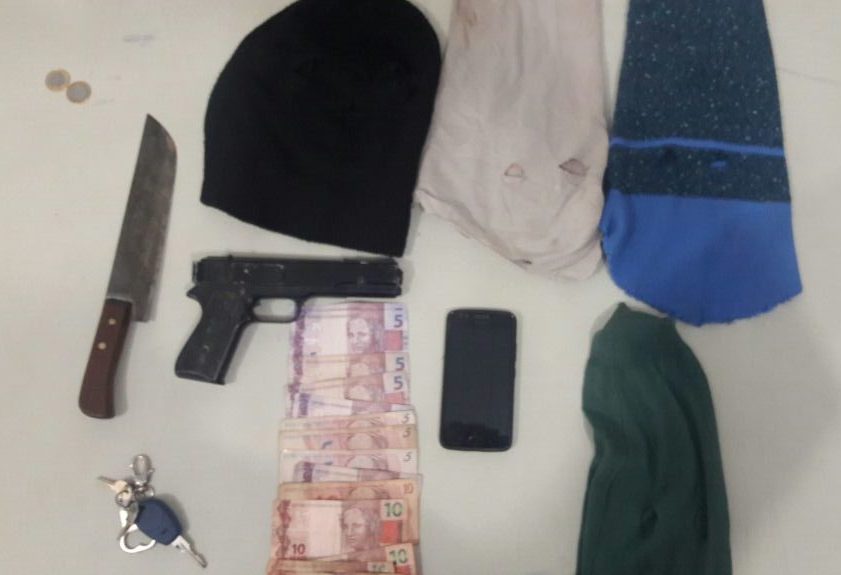 O carro foi parado e durante a abordagem os policiais militares encontraram quatro toucas do tipo “ninja”, arma de fogo falsa e um facão.