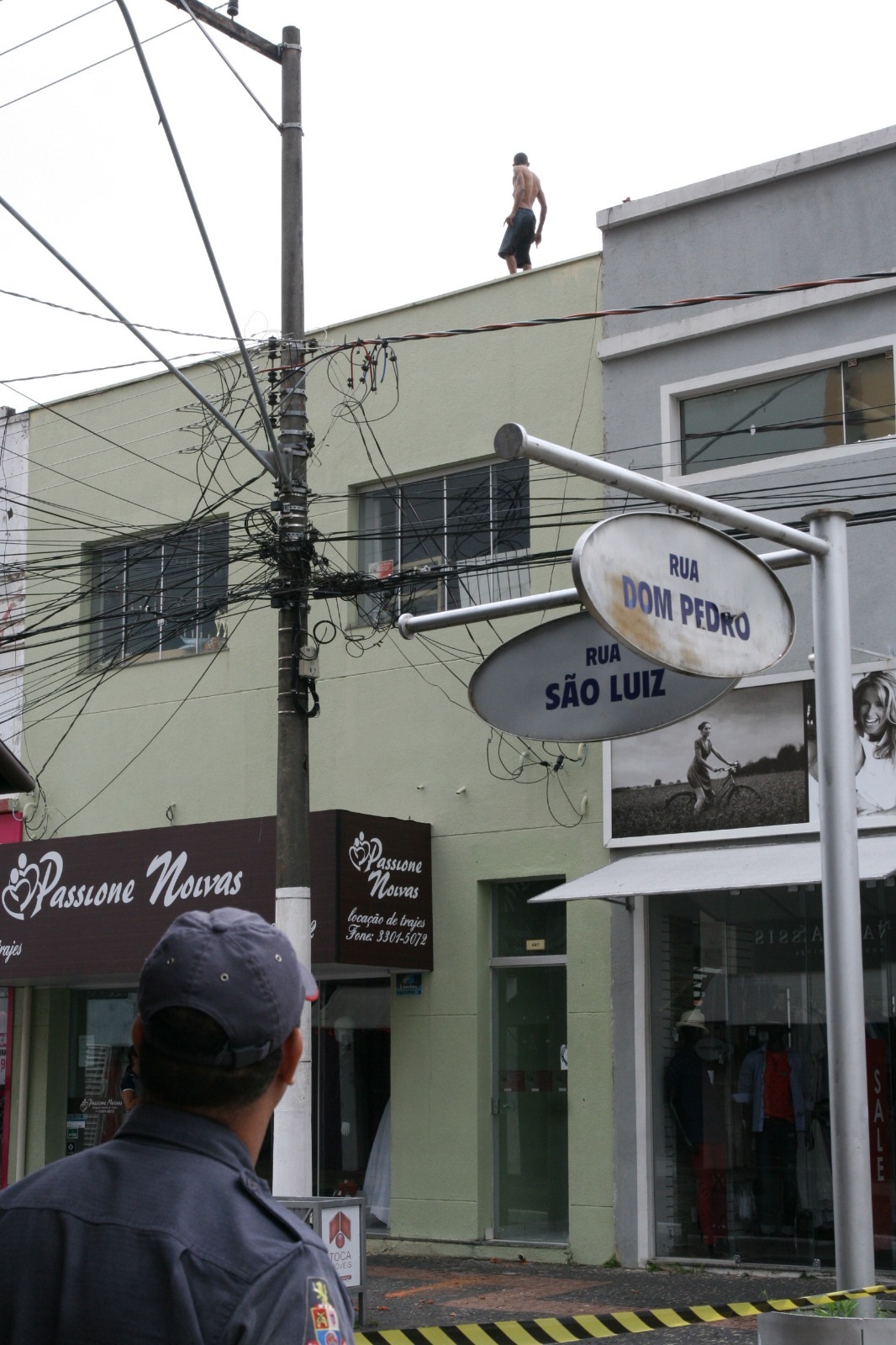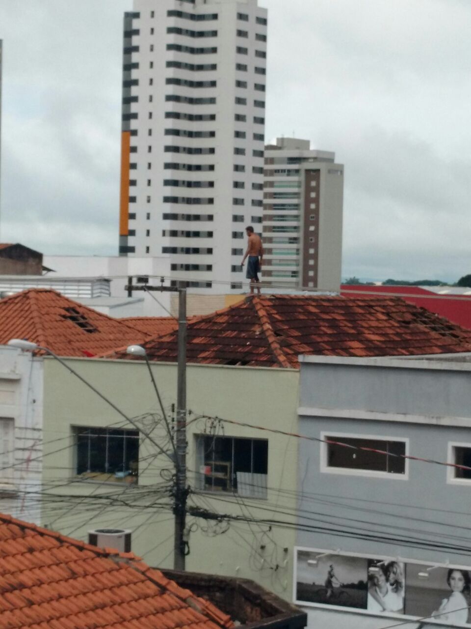 Um homem visivelmente transtornado foi flagrado pela funcionária de uma loja, dentro do estabelecimento, logo após a abertura do comércio. O ladrão correu para os fundos do imóvel e subiu no telhado, passando em seguida para cobertura de várias lojas no centro.