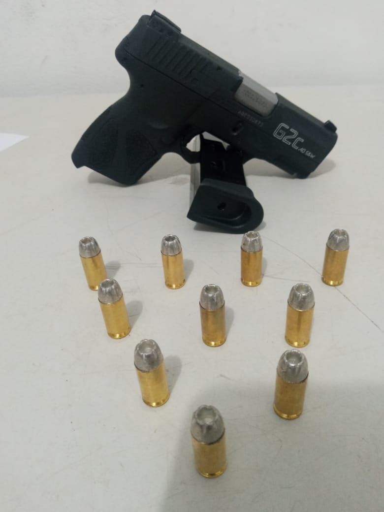Os PMs fiscalizaram o automóvel e encontraram sobre o banco traseiro um coldre contendo uma pistola .40 e um carregador com 10 munições intactas.