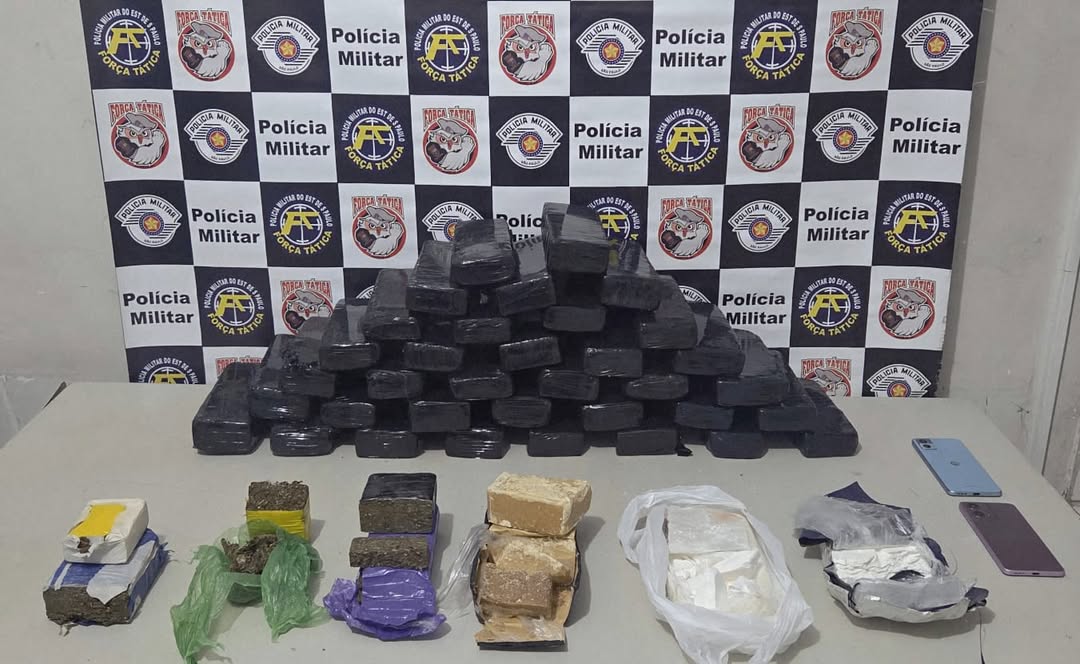 No total, foram apreendidos 24,659 quilos de maconha e 1,092 de cocaína. Também foi totalizado 1,142 quilo de crack. Além das drogas, os policiais apreenderam dois celulares, a mochila e o tambor utilizados para ocultar os entorpecentes.