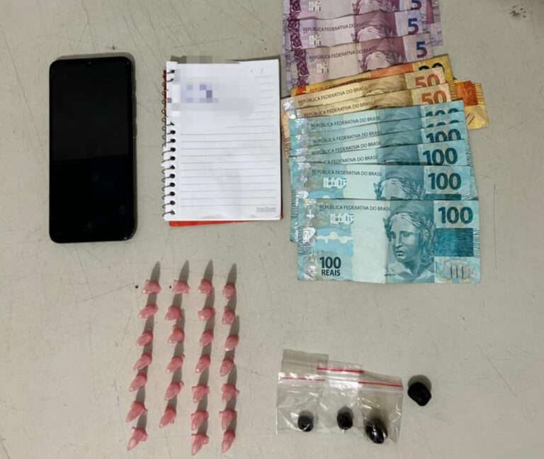 Durante a busca no imóvel, os policiais encontraram 27 microtubos com cocaína, quatro porções de maconha do tipo “dry”, uma caderneta com anotações relacionadas ao tráfico, um celular Motorola e R$ 762.