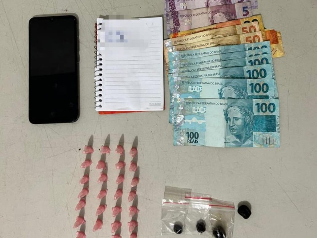 Durante a busca no imóvel, os policiais encontraram 27 microtubos com cocaína, quatro porções de maconha do tipo “dry”, uma caderneta com anotações relacionadas ao tráfico, um celular Motorola e R$ 762.