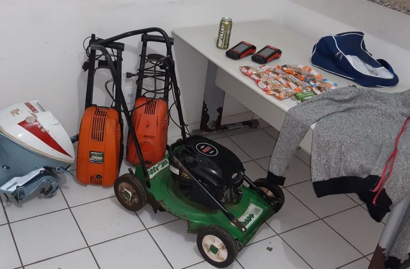 No imóvel, os militares localizaram um motor de poupa, um roçadeira, duas lavadoras de pressão, duas máquinas de cartão pertencentes a um bar furtado na avenida República, 11 pacotes de amendoim japonês, um cerveja e oito balas pertencentes ao bar furtado na avenida Rio Branco.