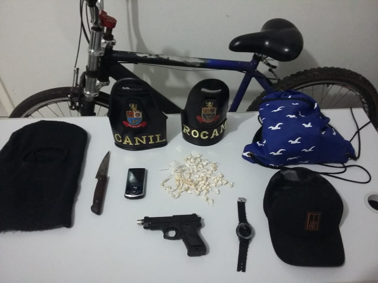 Objetos e drogas apreendidos com acusado de roubo em farmácia da avenida Durval de Menezes, Nova Marília (Foto: Divulgação)
