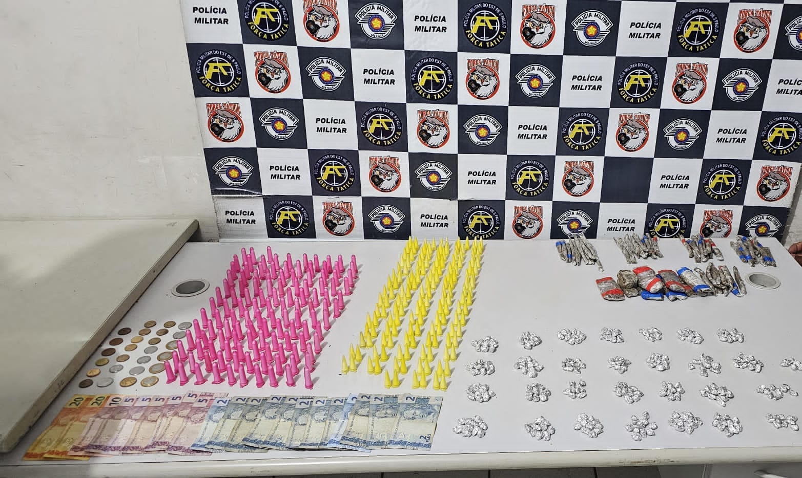 O homem chegou a entrar em um imóvel, mas foi contido pelos militares. Com ele havia uma sacola com 279 pinos com cocaína, 285 porções de crack, 59 porções de maconha e R$ 111,40.
