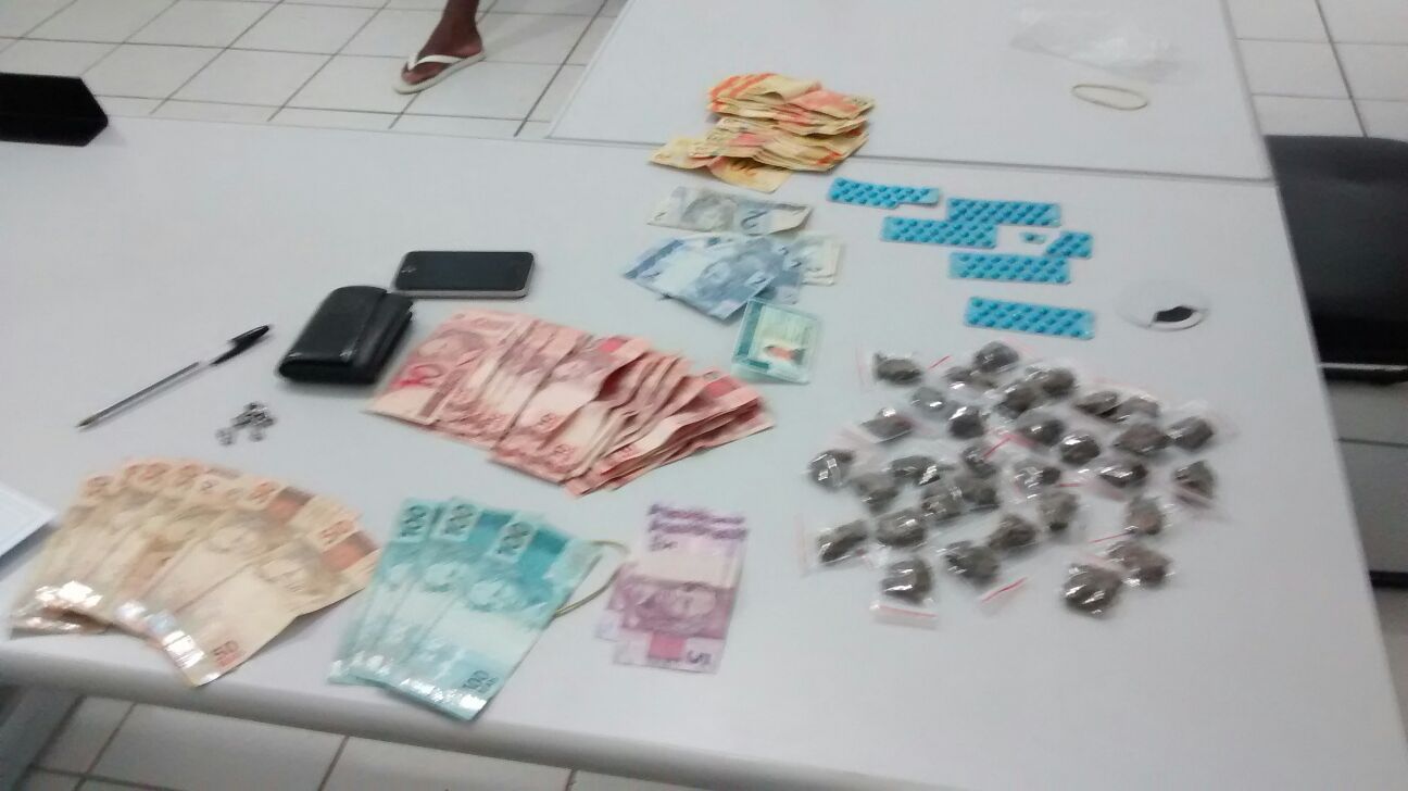 Foram apreendidas 32 porções de maconha, 106 comprimidos de Pramil (remédio que estimula a potência sexual), além de R$ 1.432 em dinheiro.