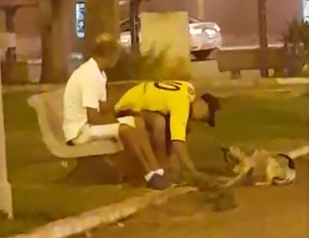 Dupla é flagrada agredindo um cachorro com golpes de pedra em praça pública de Gália. (Foto: Reprodução Web)
