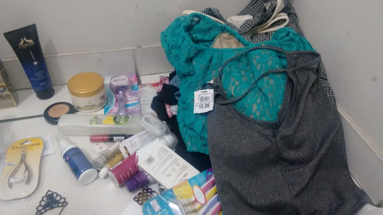 Os policiais localizaram o casal no momento em que embarcavam em um ônibus com destino ao Jardim Bandeirantes. Realizada a busca pessoal, com eles foram localizados os objetos furtados, dentre os quais, eletrônicos, roupas e cosméticos, totalizando cerca de R$ 800.