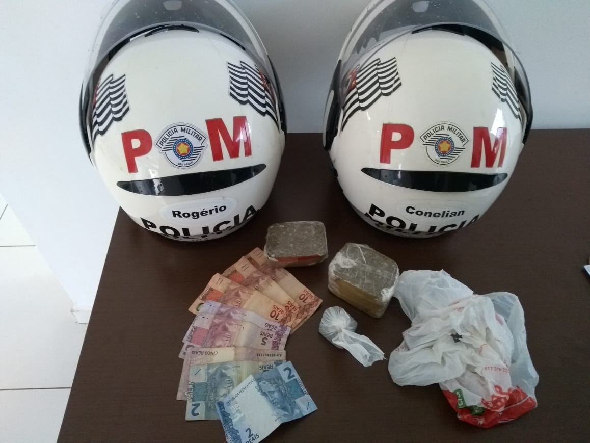 Em revista pessoal, foi localizado um tablete de maconha e R$ 1680 na casa do indiciado. Os militares também encontraram mais drogas escondidas na casa do vizinho, M.G.S.