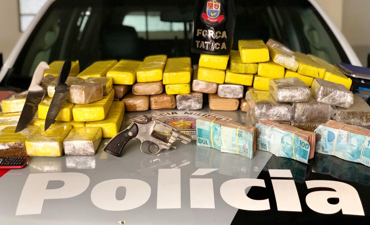 Dinheiro, drogas, facas e arma de fogo apreendidas em ação da Polícia Militar (Foto: Divulgação)