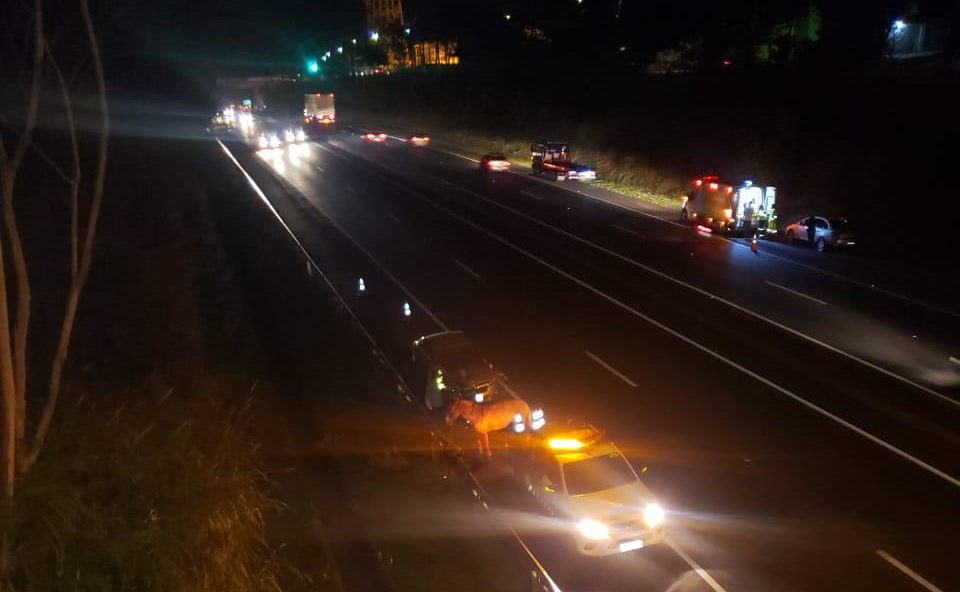 De acordo com os policiais rodoviários que atenderam a ocorrência, dois carros haviam colidido com a mula, que correu na direção da moto, por isso o motociclista não teve tempo de se esquivar.