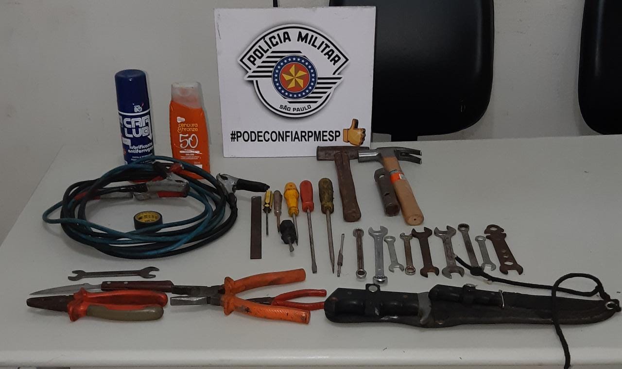 Ferramentas apreendidas durante o flagrante de furto de veículo na Avenida Pedro de Toledo (Foto: Divulgação)