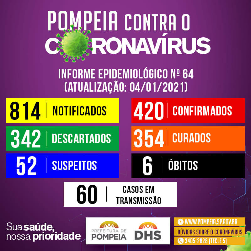 O município chega a 420 casos registrados da doença, contabilizados desde o início da pandemia. Destes, 60 pessoas estão em fase de transmissão da doença, seis morreram e 354 estão curadas.