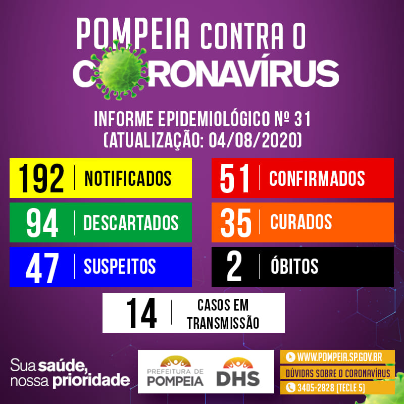 O Departamento de Higiene e Saúde de Pompeia (distante 31 quilômetros de Marília) confirmou mais seis testes positivos de Covid-19 nesta terça-feira (4).