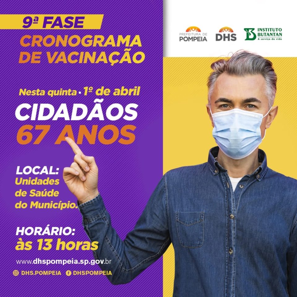 O Departamento de Higiene e Saúde (DHS) de Pompeia (distante 31 quilômetros de Marília) passa a vacinar cidadãos de 67 anos, nesta quinta-feira (1), a partir das 13h, nas Unidades de Saúde da Família.