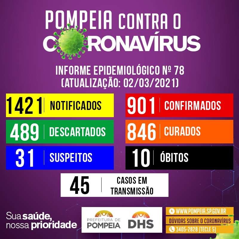 A Prefeitura de Pompeia (distante 31 quilômetros de Marília) confirmou mais 20 testes positivos de Covid-19 nesta terça-feira (2).