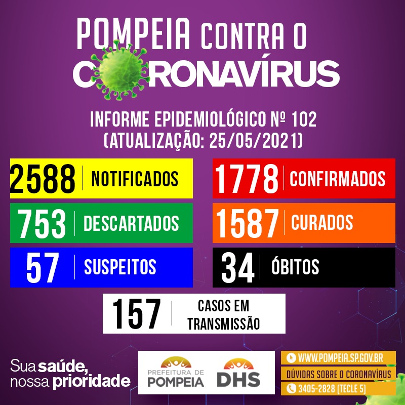 A Prefeitura de Pompeia (distante 31 quilômetros de Marília) divulgou cinco novas mortes por complicações da Covid-19 nesta terça-feira (25). A administração municipal diz que o pico da pandemia atinge a cidade.