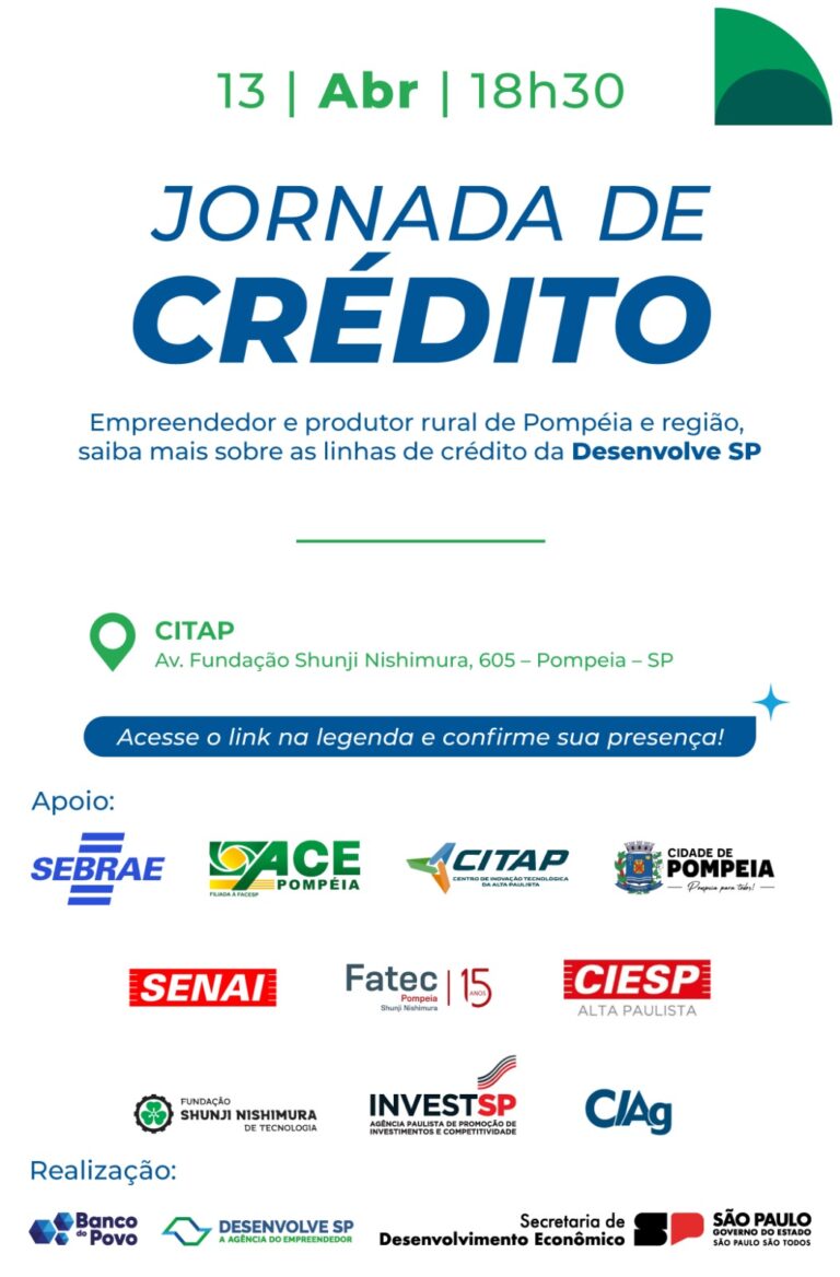 Empresários de Pompeia e região terão acesso a orientações sobre linhas de financiamento durante a Jornada de Crédito promovida pela Desenvolve SP na próxima segunda-feira (13), às 18h30, na Fundação Shunji Nishimura de Tecnologia. O evento é gratuito e tem como objetivo ampliar o acesso ao crédito produtivo e incentivar investimentos e modernização dos negócios.