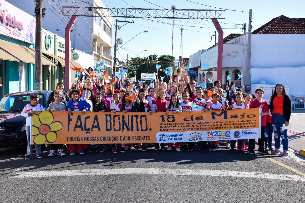 A ação contou com a participação ativa de crianças e adolescentes das escolas municipais, estaduais e colégios particulares, que levaram cartazes, mensagens e faixas alusivos ao tema, em um gesto simbólico de união e consciência social. Um dos destaques foi a apresentação da fanfarra da Apae de Pompeia, que abrilhantou o percurso com música e emoção, sendo calorosamente aplaudida por todos os presentes.