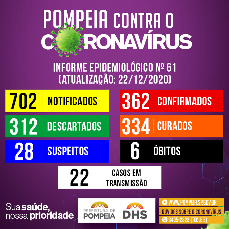 A Prefeitura de Pompeia (distante 31 quilômetros de Marília) confirmou mais 16 casos positivos de coronavírus nesta quarta-feira (23).