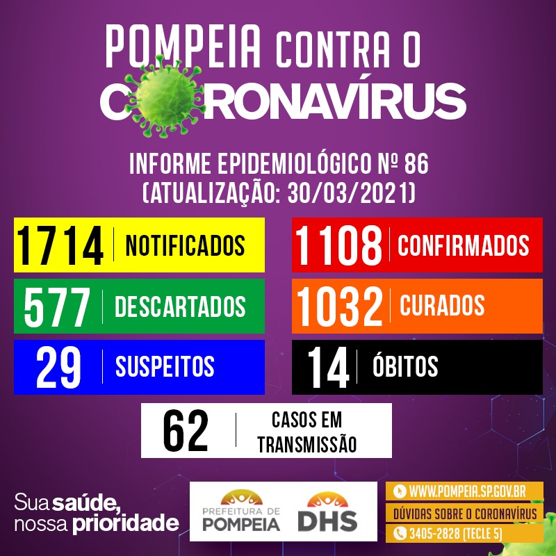 A Prefeitura de Pompeia (distante 31 quilômetros de Marília) divulgou 46 novos testes positivos de Covid-19 nesta terça-feira (30).