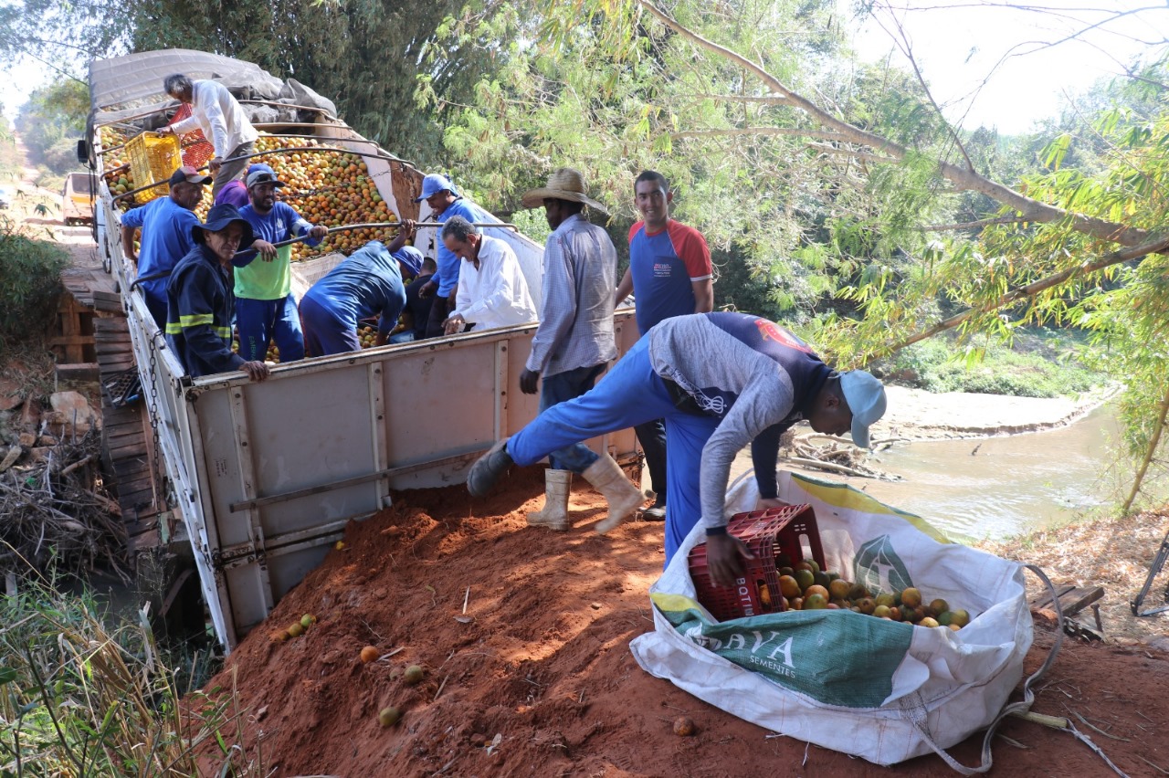 Em nota, a Prefeitura afirma que enviou equipes para acompanhar a operação de retirada da carga de frutas (laranja). “Esclarece que a ponte tem capacidade máxima para suportar até 10 toneladas. A carreta, só de carga, estava com aproximadamente 30 toneladas, acrescido ao peso do veículo, a ponte foi submetida a um peso no mínimo 5 vezes maior. Assim que a retirada das laranjas for concluída, a carreta será retirada do local.”
