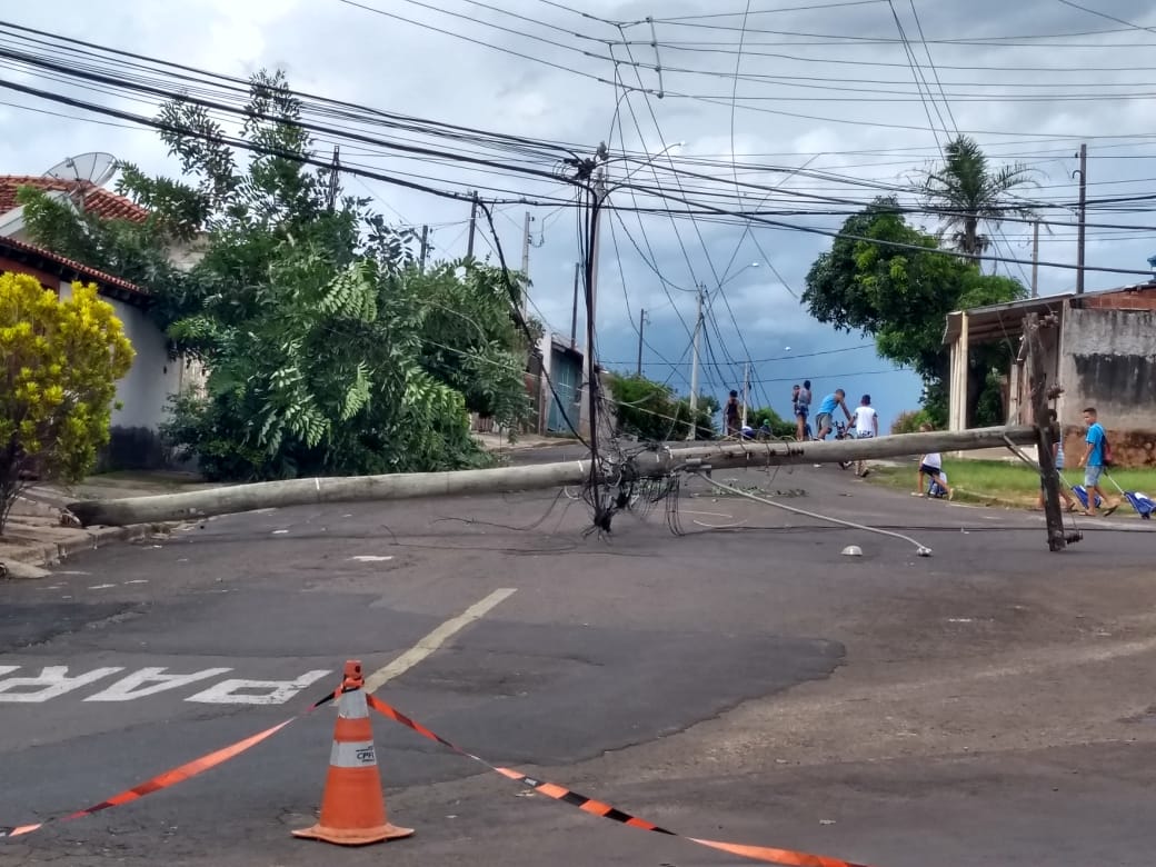 Um poste tombou e ficou no meio da rua suspenso por fios, próximo ao chão, na tarde desta quarta-feira (20) nas proximidades do Parque das Azaleias, na zona Sul de Marília.
