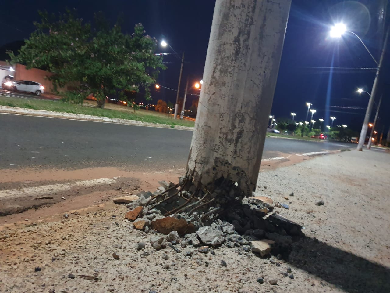 A base de concreto do poste foi totalmente comprometida, possivelmente após a ocorrência de suposta colisão contra o dispositivo, localizado na continuidade da rua Hermínio Cavallari, depois do condomínio Residencial Murano.