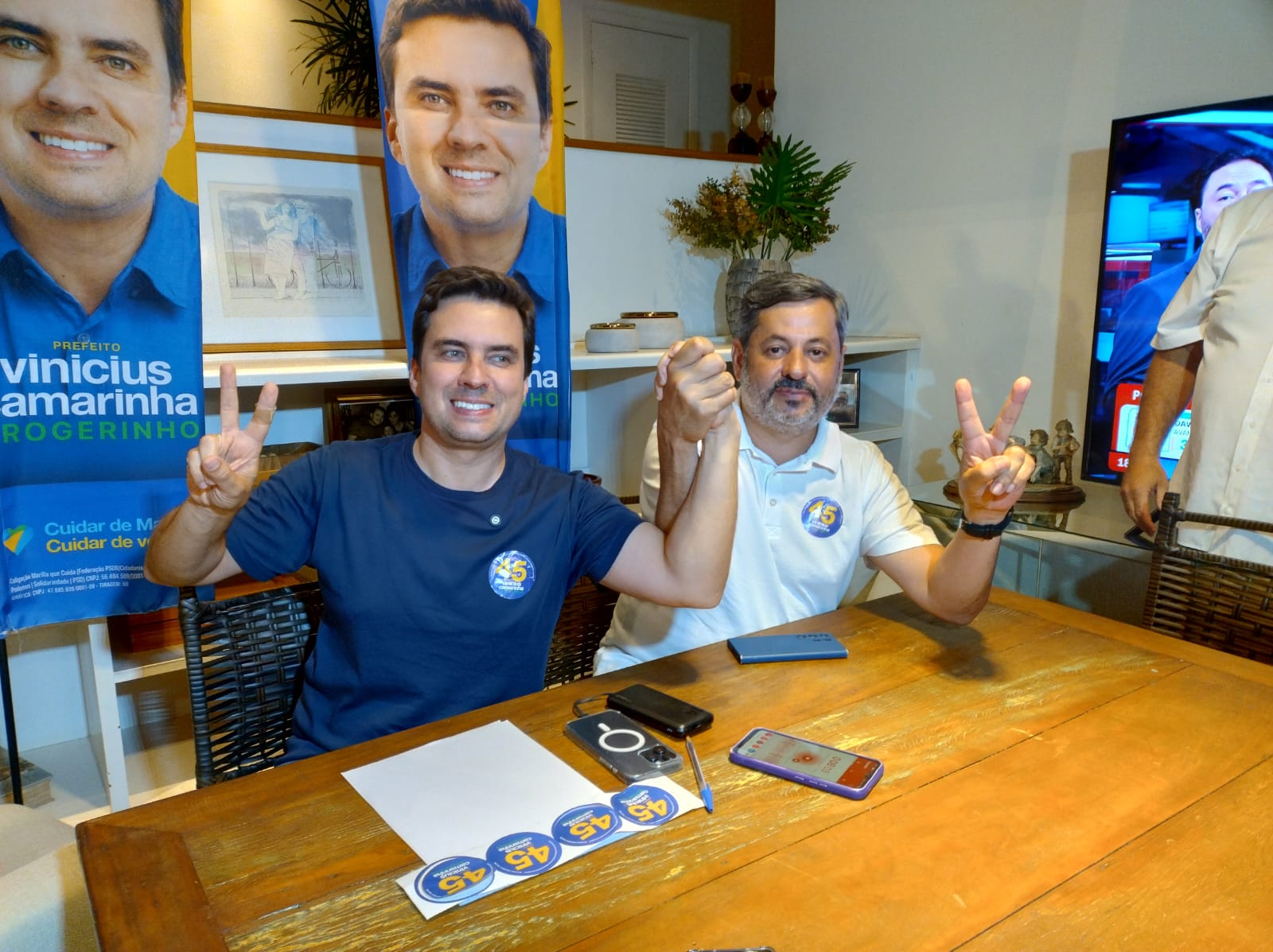 Sentado ao lado do seu vice Rogerinho (PP), Vinicius iniciou seu pronunciamento com agradecimentos a Deus, familiares, equipe de apoio de campanha e ao “povo que foi leal, dando para gente uma votação expressiva”.