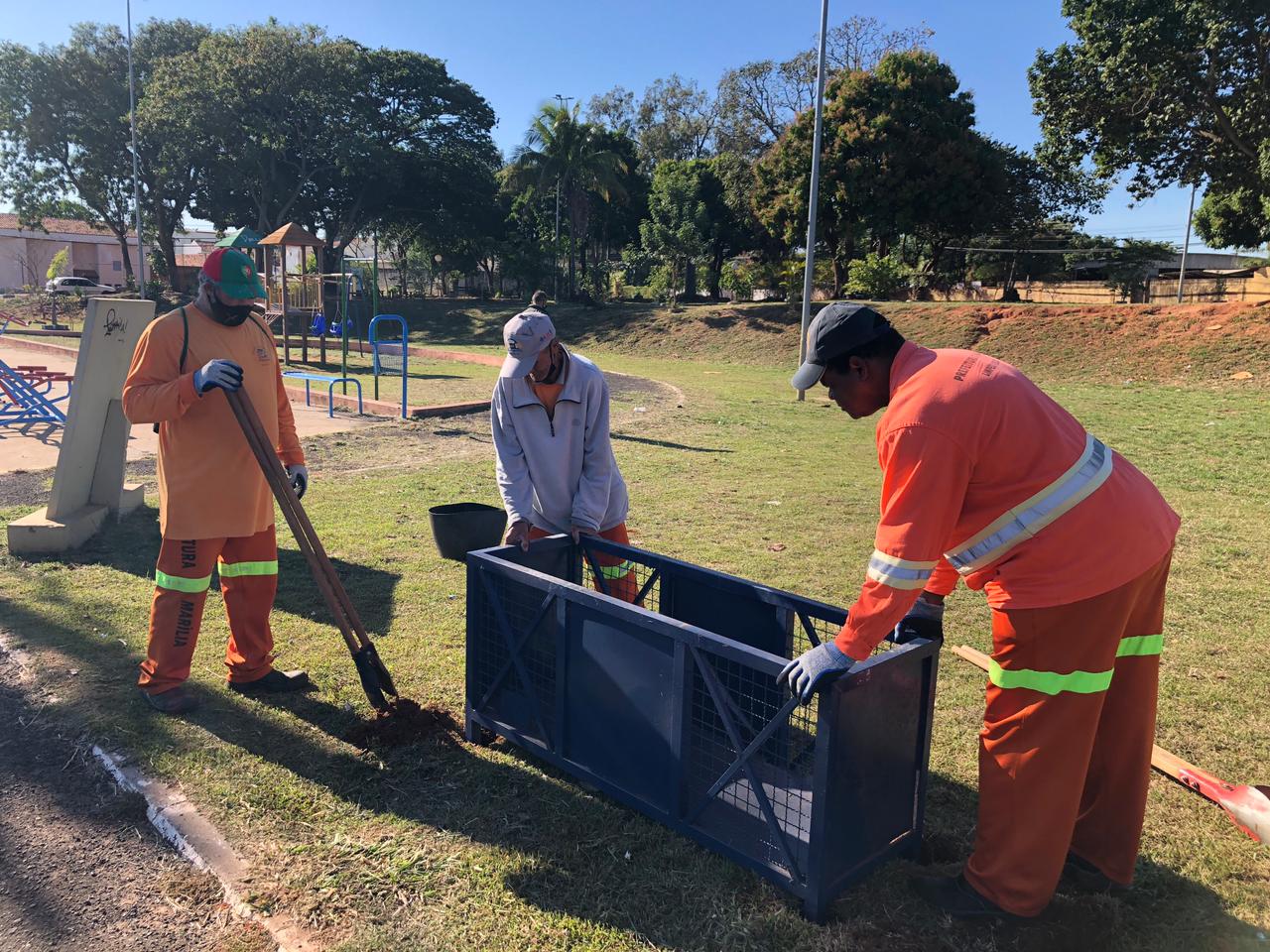 Equipe instala lixeira em praça no Jardim Cavallari (Foto: Divulgação)